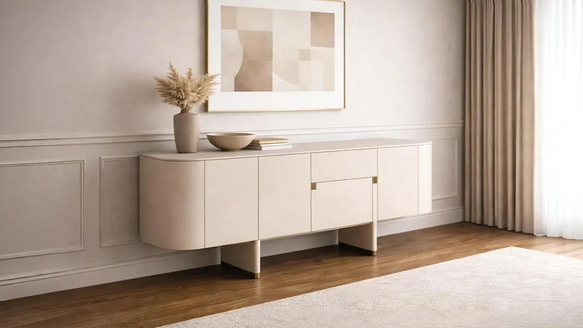 • Ekskluzivna bela komoda sa finim vertikalnim teksturama i zlatnim akcentima